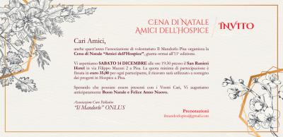 Vi aspettiamo SABATO 14 DICEMBRE alle ore 19:30 presso il San Ranieri Hotel in via Filippo Mazzei 2 a Pisa. La quota minima di partecipazione è fissata in euro 35,00 per ogni partecipante, il ricavato sarà utilizzato a sostegno dei progetti in Hospice a Pisa.